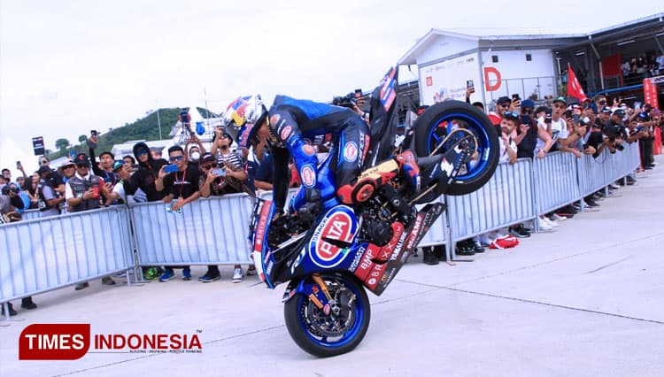 TIMES Mataram/Pembalap PATA Yamaha Brixx Toprak Razgatlioglu melakukan atraksi stopie ban depan usai memenangi race 1 WSBK Mandalika 2022, Sabtu (12/11/2022). (FOTO: Tria Adha/TIMES Indonesia).