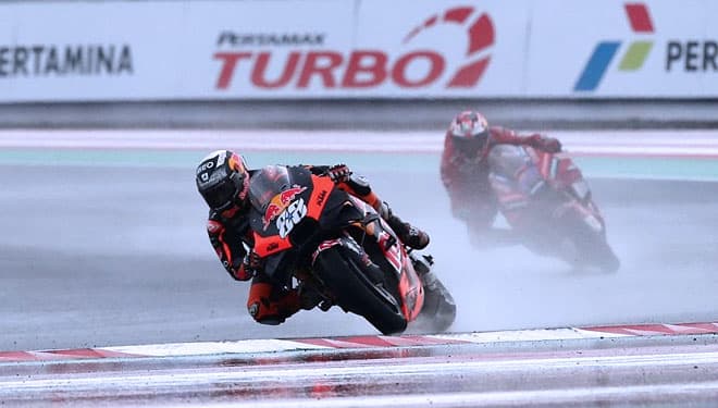 LOMBOK TENGAH – Pembalap Portugis Miguel Oliveira memenangi balapan MotoGP Mandalika 2022 yang berlangsung dalam kondisi trek basah, Minggu (20/3/2022). Posisi kedua pada balapan di Sirkuit Mandalika yang merupakan seri kedua MotoGP ditempati sang juara dunia 2021 Fabio Quartararo. Sedangkan podium ketiga diklaim pembalap asal Prancis Johann Zarco