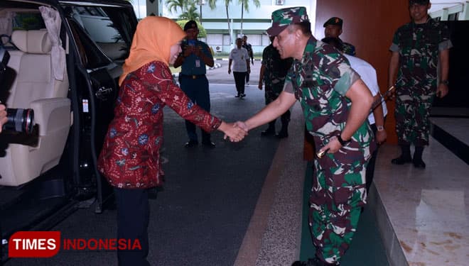 TIMES Mataram/Pangdam V/Brawijaya, Mayjen TNI Wisnoe, P.B, menyambut kedatangan Gubernur Jatim, Khofifah Indar Parawansa di Makodam V/Brawijaya, Rabu (20/2/2019).(Foto: Istimewa)